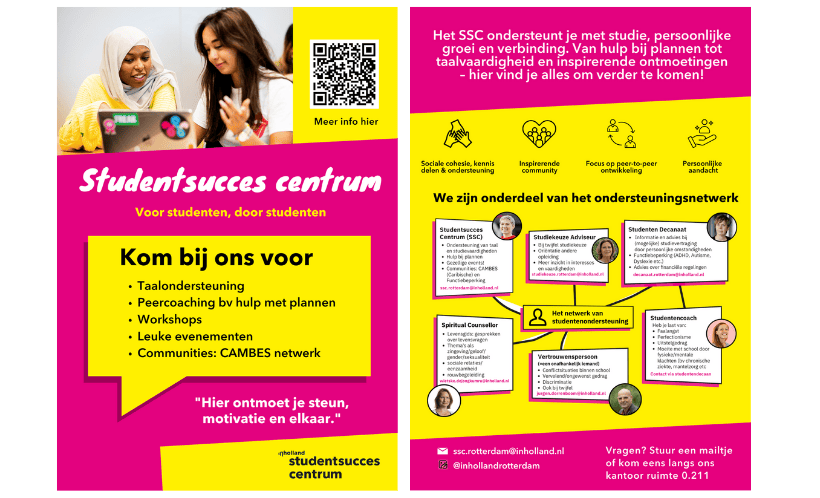 Ontwikkeling van grafische ontwerpen voor Hogeschool Inholland Rotterdam, waaronder content voor social media, posters door het hele gebouw en flyers voor voorlichtingen en evenementen.